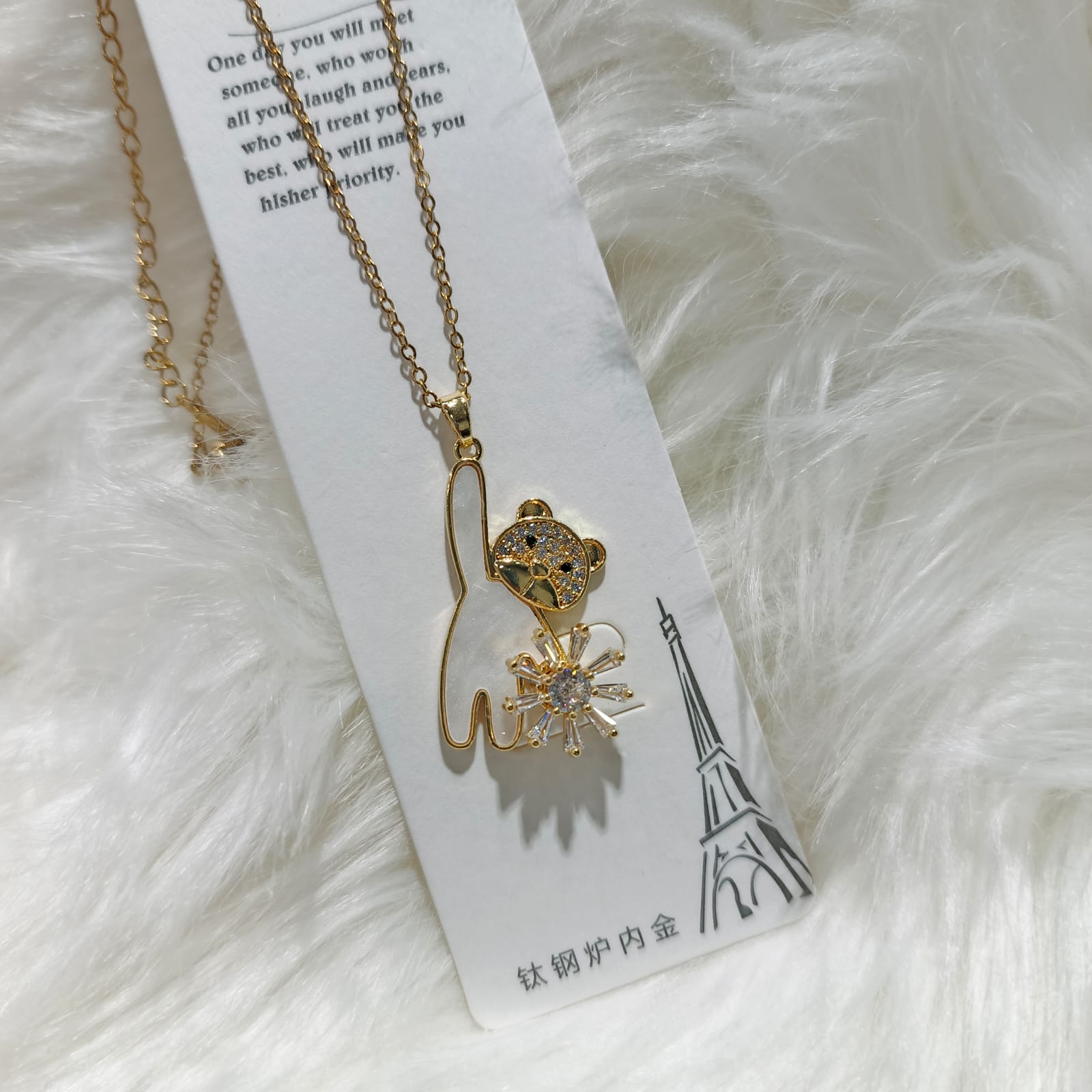 Embrace sweetness and charm with this delightful pendant necklace featuring an adorable teddy bear holding a sparkling flower. This whimsical design combines playful innocence with elegant craftsmanship, creating a piece that's both heartwarming and stylish.