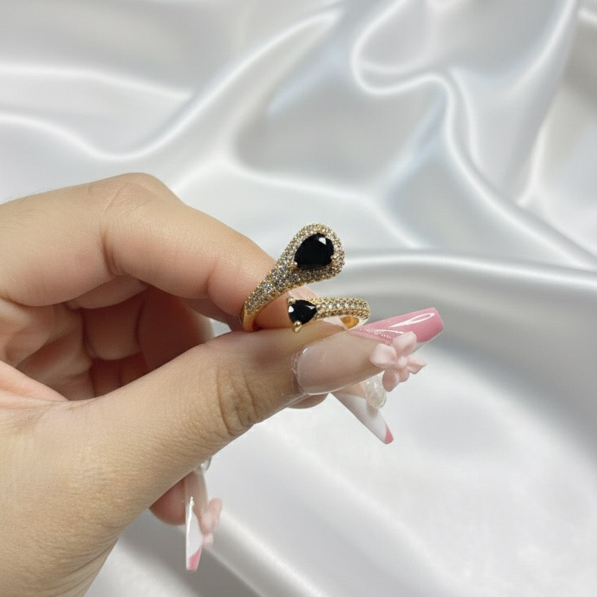 Design Details: This stunning open-style ring showcases two glossy black teardrop stones, each encircled by shimmering micro-pavé crystals in a gold setting. The bypass design elegantly wraps around the finger, with the two teardrops creating a beautiful asymmetric balance. The contrasting black and gold color palette exudes timeless luxury and contemporary edge.
