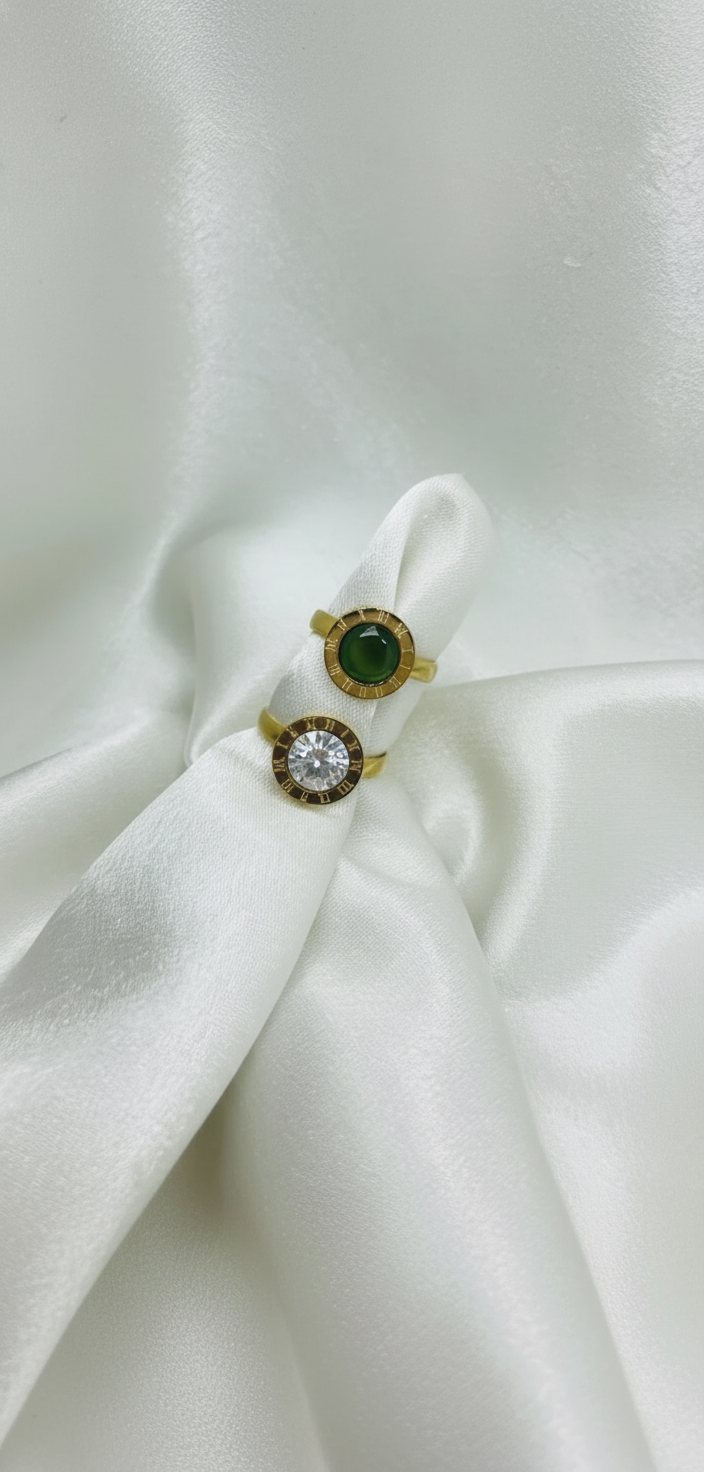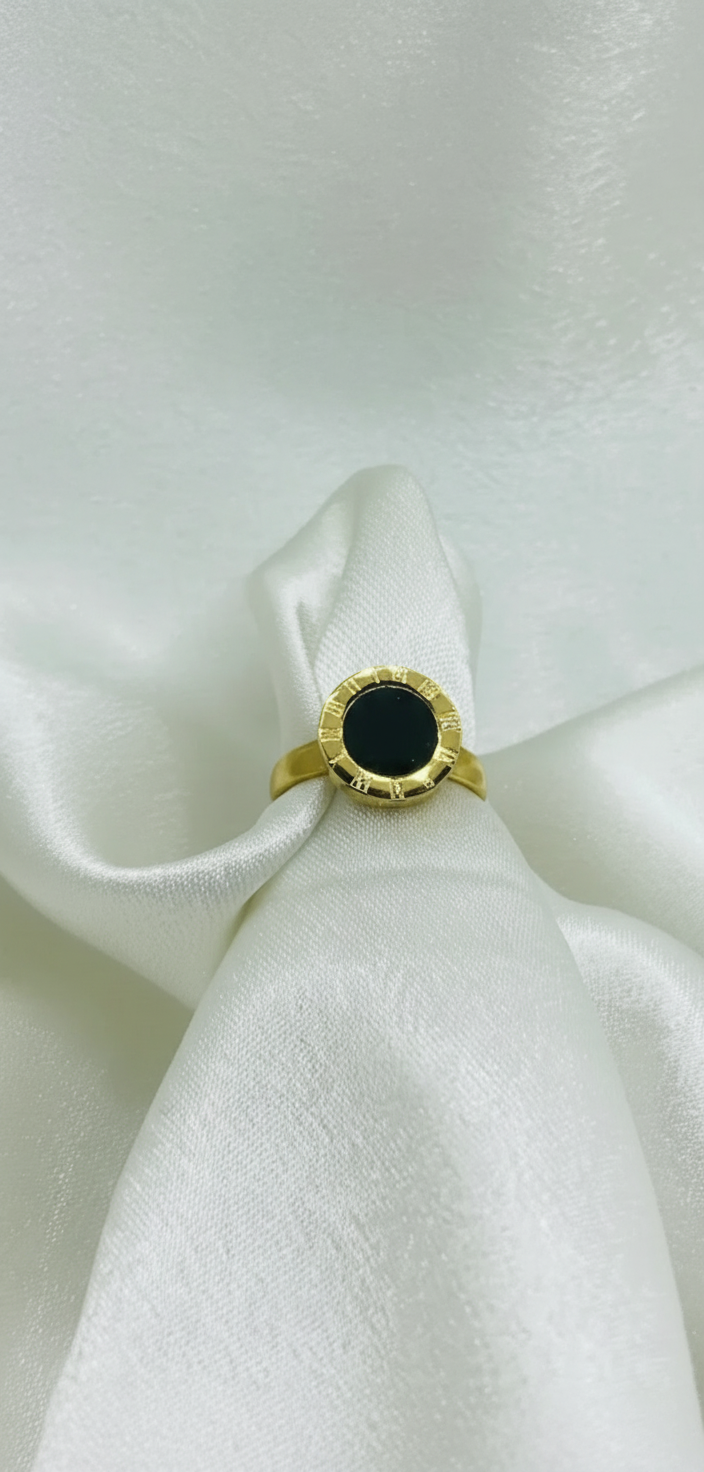 - Black Stone Ring: Features a bold black circular center stone surrounded by Roman numeral-style detailing in gold tone