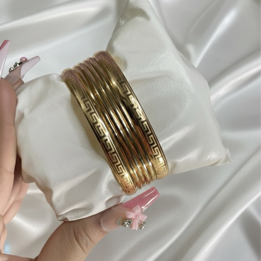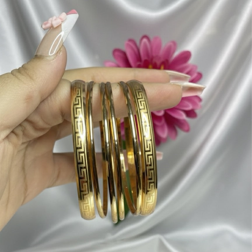 Add a touch of timeless elegance to your style with this set of golden bangles, beautifully crafted to exude sophistication and grace. Featuring a sleek polished finish and a delicate Greek key pattern, these bangles strike the perfect balance between modern chic and classic charm.